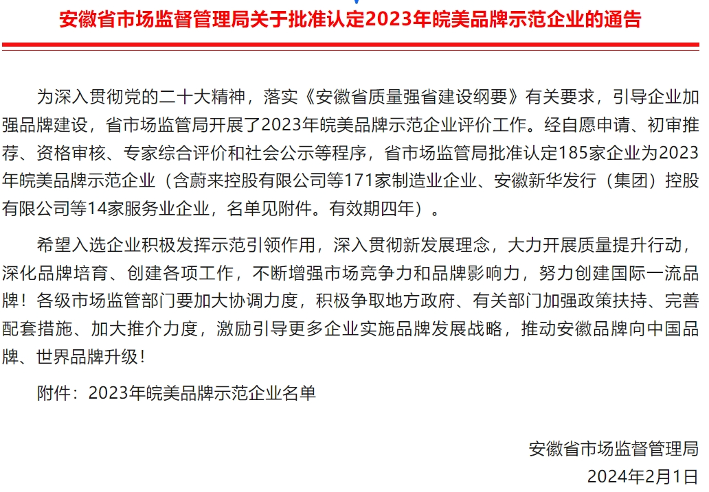 為深入貫徹落實《安徽省質量強省建設綱要》,大力推進品牌建設,經企業(yè)自愿申請、各市(縣)市場監(jiān)管局推薦、資格審核和專家綜合評價等流程層層篩選,中國宣紙股份有限公司成功入選2023年皖美品牌示范企業(yè)! “皖美品牌”示范企業(yè)是深入貫徹落實《安徽省質量強省建設綱要》等文件精神,發(fā)揮品牌在建設質量強省、發(fā)展新興產業(yè)中的引領作用,培育認定的品質卓越、服務優(yōu)良、信譽過硬的自主品牌優(yōu)秀企業(yè)。 本次入選“皖美品牌示范企業(yè)”,是對中國宣紙股份有限公司品牌影響力極大的肯定。未來,我司將充分發(fā)揮皖美品牌企業(yè)示范作用,持續(xù)擴大品牌影響力,為美好安徽建設貢獻更多力量。 序號 企業(yè)名稱 1 蔚來控股有限公司 2 合肥新滬屏蔽泵有限公司 3 四創(chuàng)電子股份有限公司 4 安徽萬瑞冷電科技有限公司 5 合肥中南光電有限公司 6 安徽新華發(fā)行(集團)控股有限公司 7 合肥工大高科信息科技股份有限公司 8 安徽樂庫智能停車設備有限公司 9 中水三立數據技術股份有限公司 10 安徽宏源鐵塔有限公司 11 安徽合凱電氣科技股份有限公司 12 合肥惠科金揚科技有限公司 13 安徽輝隆集團銀山藥業(yè)有限責任公司 14 安徽環(huán)瑞電熱器材有限公司 15 安徽科創(chuàng)中光科技股份有限公司 16 安徽肥肥網絡傳媒有限責任公司 17 安徽廬峰交通科技有限公司 18 合肥豐華汽車零部件有限公司 19 合肥市菲力克斯電子科技有限公司 20 合肥開關廠有限公司 21 合肥欣奕華智能機器股份有限公司 22 安徽皖信人力資源管理有限公司 23 安徽德科電氣科技有限公司 24 合肥晟泰克汽車電子股份有限公司 25 華誼城市服務科技有限公司 26 安徽大千生物工程有限公司 27 合肥琥珀家具有限責任公司 28 安徽中科中渙智能裝備股份有限公司 29 安徽永昌新材料有限公司 30 合肥海特微波科技有限公司 31 安徽遠成物業(yè)管理有限公司 32 安徽嘉偉新材料科技有限責任公司 33 安徽諾益科技有限公司 34 安徽中源環(huán)保科技有限公司 35 安徽卓越電力設備有限公司 36 合肥迅達包裝股份有限公司 37 安徽科凌沃特水處理技術有限公司 38 長鑫存儲技術有限公司 39 安徽金巖高嶺土新材料股份有限公司 40 安徽康迪納電力科技有限責任公司 41 方園(安徽)智能裝備有限責任公司 42 安徽中冶淮海裝配式建筑有限公司 43 安徽省虹源飼料科技有限公司 44 安徽慶豐涂料科技有限公司 45 安徽馮了性中藥材飲片有限公司 46 信和光能(安徽)有限公司 47 利辛縣富亞紗網有限公司 48 安徽智揚門業(yè)股份有限公司 49 安徽亞珠金剛石股份有限公司 50 安徽億人安股份有限公司 51 安徽省伊貝雅紡織股份有限公司 52 安徽儒特實業(yè)有限公司 53 安徽高堅機械科技有限公司 54 實慕家居有限公司 55 安徽新秀化學股份有限公司 56 安徽飛凱電子技術有限公司 57 安徽海尚變頻技術有限公司 58 安徽豐原福泰來聚乳酸有限公司 59 安徽克菱保健科技有限公司 60 蚌埠天成包裝科技股份有限公司 61 安徽興宇軌道裝備有限公司 62 安徽省華凱輕工科技有限公司 63 安徽開來包裝有限公司 64 安徽精菱玻璃機械有限公司 65 安徽云龍糧機有限公司 66 安徽佳安智慧養(yǎng)老服務有限公司 67 安徽瑞琦塑膠科技有限公司 68 阜南佳利工藝品股份有限公司 69 阜陽欣奕華材料科技有限公司 70 安徽京九絲綢股份公司 71 安徽聚力糧機科技股份有限公司 72 界首市金龍機械設備有限公司 73 安徽興安電氣設備股份有限公司 74 安徽省天翔醫(yī)療股份有限公司 75 美亞高新材料股份有限公司 76 安徽維東建材股份有限公司 77 安徽唐興裝備科技股份有限公司 78 安徽三興檢測有限公司 79 平安開誠智能安全裝備有限責任公司 80 安徽中宇玻璃制品有限公司 81 安徽九綱機電有限公司 82 安徽開潤股份有限公司 83 通用生物(安徽)股份有限公司 84 安徽揚子安防股份有限公司 85 安徽光智科技有限公司 86 晶鋒集團股份有限公司 87 滁州惠科光電科技有限公司 88 安徽眾博新材料有限公司 89 安徽秀朗新材料科技有限公司 90 安徽金鵬節(jié)能科技股份有限公司 91 安徽博石高科新材料股份有限公司 92 安徽省浦菲爾建材有限公司 93 安徽亞蘭密封件股份有限公司 94 安徽江淮揚天汽車股份有限公司 95 安徽省益農化工有限公司 96 安徽省瀚海新材料股份有限公司 97 安徽省六安恒源機械有限公司 98 安徽星鑫材料科技股份有限公司 99 霍山匯能汽車零部件制造有限公司 100 安徽首礦大昌金屬材料有限公司 101 安徽管仲木業(yè)有限公司 102 安徽太陽體育用品有限公司 103 安徽海瑞通科技股份有限公司 104 三聯(lián)泵業(yè)股份有限公司 105 馬鞍山宏力橡膠制品有限公司 106 安徽桑瑞斯環(huán)保新材料有限公司 107 安徽天順環(huán)保設備股份有限公司 108 安徽宏翔農業(yè)機械有限公司 109 馬鞍山市廣源法蘭環(huán)件有限公司 110 安徽錦華氧化鋅有限公司 111 盾安(蕪湖)中元自控有限公司 112 中鼎恒盛氣體設備(蕪湖)股份有限公司 113 蕪湖佳先傳動軸有限公司 114 蕪湖金牛電氣股份有限公司 115 安徽宇測線纜質檢技術有限公司 116 來邦科技股份公司 117 安徽華通電纜集團有限公司 118 蓓慈電器有限公司 119 東隆家紡股份有限公司 120 蕪湖安瑞光電有限公司 121 蕪湖市夯福機械模